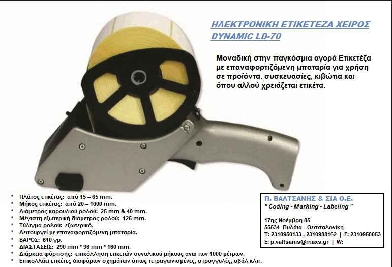 - φορητά τυπωτικά χειρός, ηλεκτρονικά, για εύκολη και άμεση σήμανση/μαρκάρισμα με σύστημα ψεκασμού μελάνης σε οποιοδήποτε προϊόν και με πληθώρα δυνατοτήτων όπως εκτύπωση αυτόματων ημερομηνιών, κείμενα (και στα ελληνικά), αριθμούς παρτίδων (lot), γραμμωτοί κώδικες κλπ.